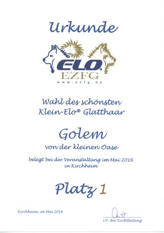 | 08.05.2016 | Elo® - Treffen in Kirchheim vom 06. - 08. Mai 2016![]() Hier freuen sich Milo & Petra wieder über Platz 1 beim Wettbewerb "Schönster Elo®" in der Gruppe Klein-Elo®-Glatthaar. |